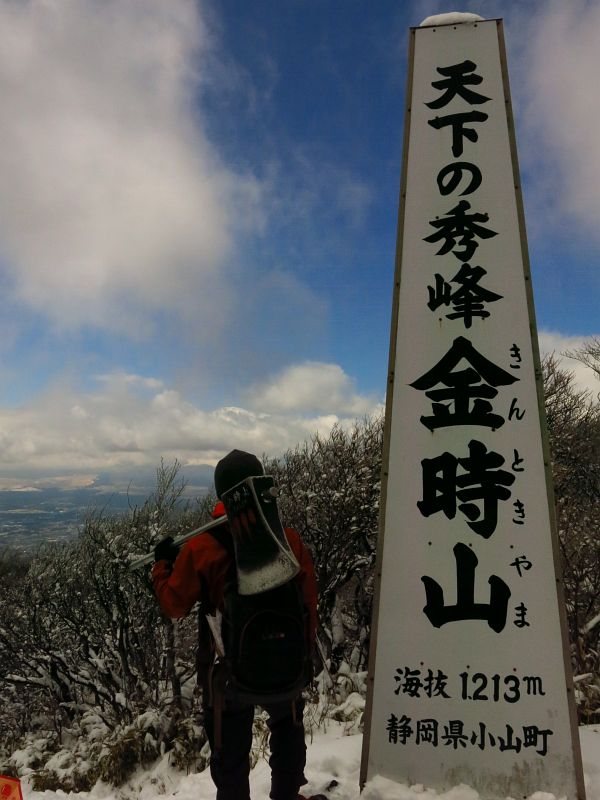 金時山山頂に到着。雲の合間から辛うじて富士山が見えます。